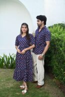 This navy blue matching outfit set includes a women?s midi dress and a men?s short-sleeve shirt, both featuring vibrant red ethnic prints. Perfect for couples who love twinning in style at casual outings, festive gatherings, or vacations.
